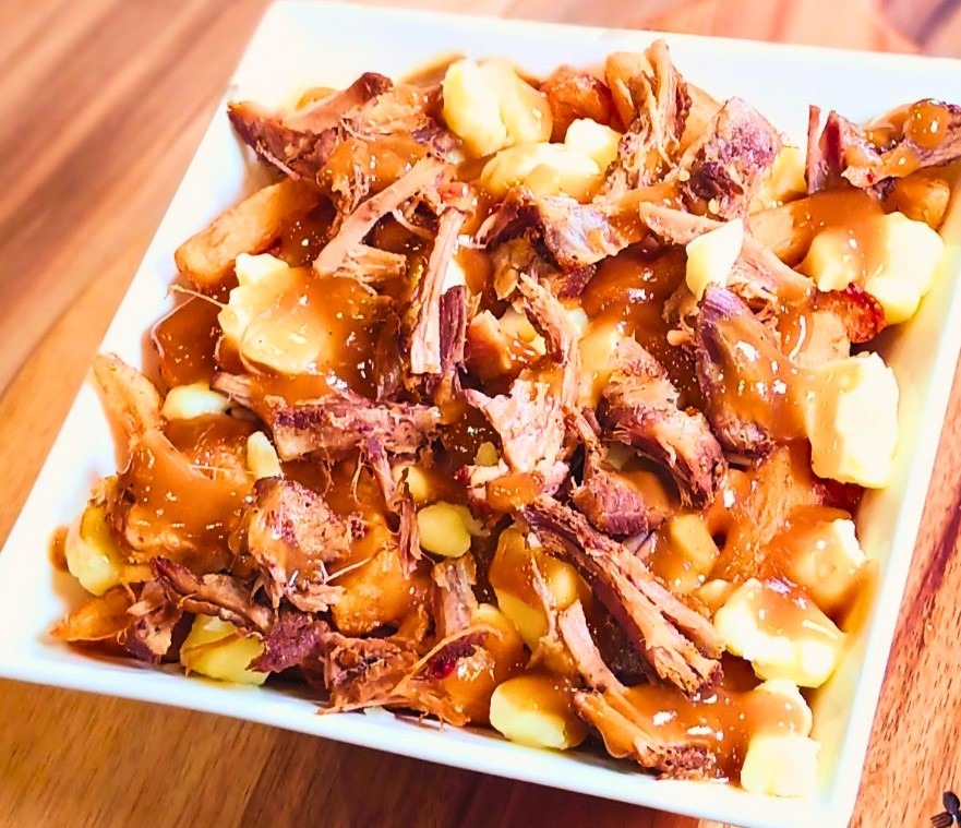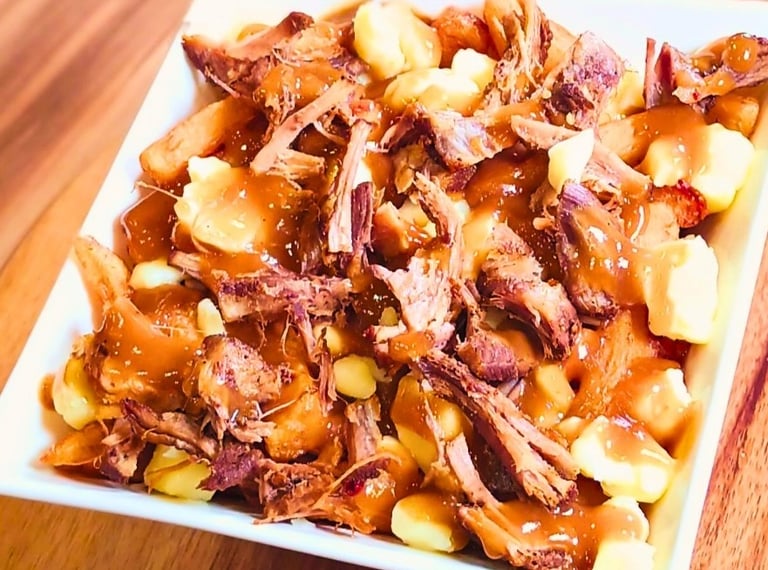 La poutine est un plat emblématique du Québec, composé de frites croustillantes, de fromage en grains et d'une sauce brune chaude. La ''poutine au griot'' est un mélange de la poutine regulière et du griot (porc haché).