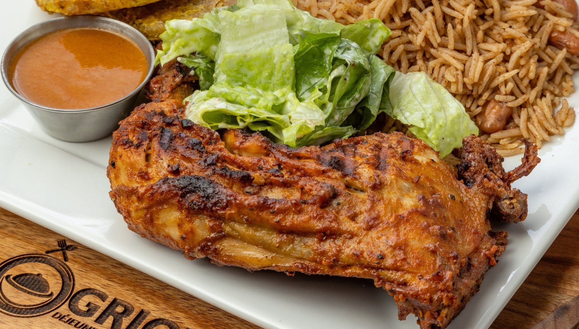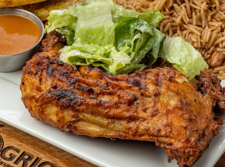 Cuisse de poulet cuit sur un grill permetant d'obtenir une peau croustillante et une chair juteuse. Souvent servi avec riz, plantains, sauce et pikliz (salade de choux).